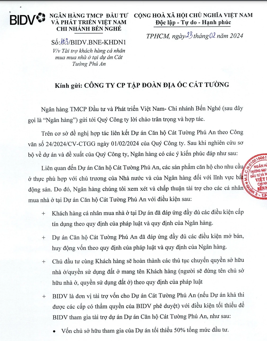 BIDV cho biết đã xem công văn đề nghị hợp tác của Cát Tường Group, và xem xét chấp thuận tài trợ cho các cá nhân mua nhà ở tại dự án căn hộ Cát Tường Phú An, với điều kiện: Khách hàng cá nhân mua nhà ở dự án đã đáp ứng đủ các điều kiện cấp tín dụng theo quy định của pháp luật và của ngân hàng; Dự án đã đáp ứng đầu đủ các điều kiện mở bán, huy động vốn theo quy định của pháp luật và quy định của ngân hàng…