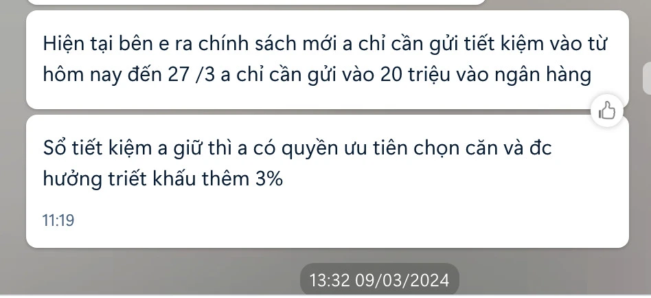 Trong bài phản ánh trước, nhân viên môi giới của Công ty CP Kinh doanh bất động sản Cát Tường Land (Cát Tường Land, công ty con Cát Tường Group - đơn vị phát triển dự án), đã "dụ" khách hàng giữ chỗ sản phẩm dự án với số tiền 50 triệu đồng. Theo nhân viên môi giới, bằng việc này khách hàng sẽ được ưu tiên chọn mua căn hộ và số tiền sẽ chuyển vào tài khoản của Cát Tường Land.