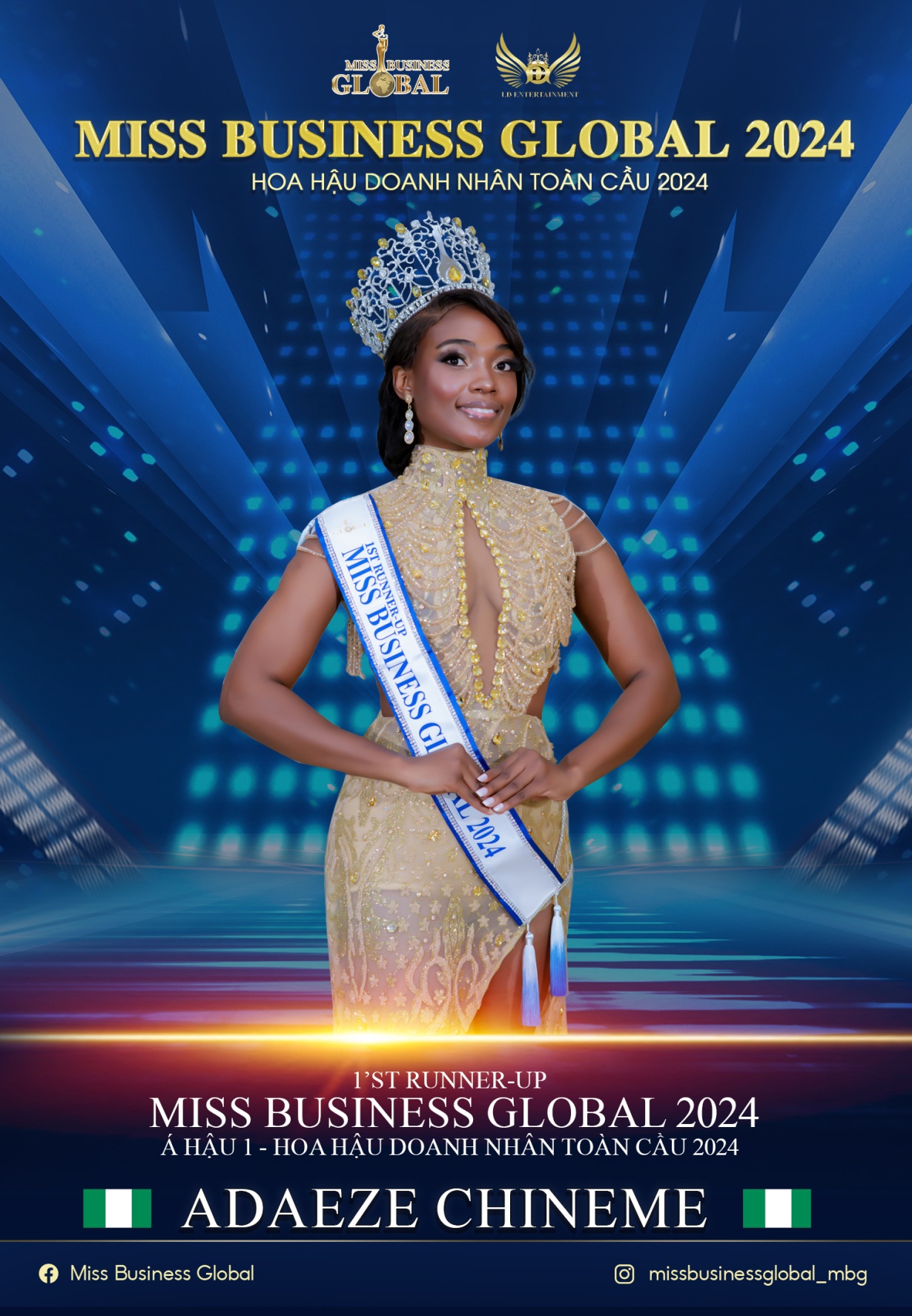 Giải thưởng 1’ST Runner-up Miss Business Global (Á Hậu 1 - Hoa Hậu Doanh Nhân Toàn Cầu 2024) gọi tên người đẹp Adaeze Chineme đến từ Nigeria (được biết người đẹp Nigeria cũng là cựu Hoa Hậu Siêu Quốc Gia Nigeria – Miss Supranational Nigeria 2022).