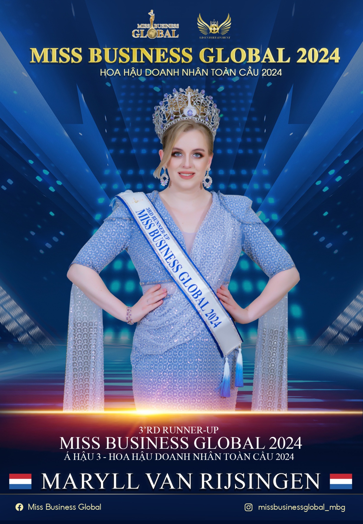 Giải thưởng 3’RD Runner-up Miss Business Global (Á Hậu 3 - Hoa Hậu Doanh Nhân Toàn Cầu 2024) thuộc về người đẹp Maryll Van Rijsinggen đến từ Netherlands.