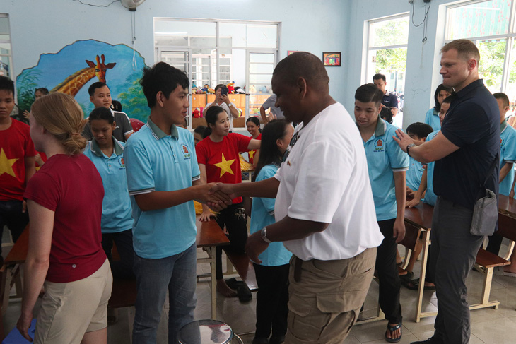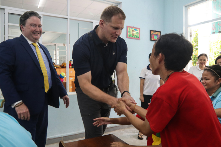 Thành viên của đoàn cựu chiến binh và thân nhân lính thủy đánh bộ Mỹ và đại sứ Mỹ tại Việt Nam, ông Marc Knapper bắt tay thăm hỏi các nạn nhân chất độc da cam tại Đà Nẵng - Ảnh: THANH NGUYÊN