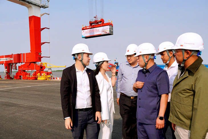 Tỉnh trưởng Svay Rieng (thứ 3 từ phải sang) nghe thuyết minh về cảng quốc tế Long An và hy vọng sớm có cửa khẩu quốc tế để thông thương qua biên giới Long An - Ảnh: AN LONG