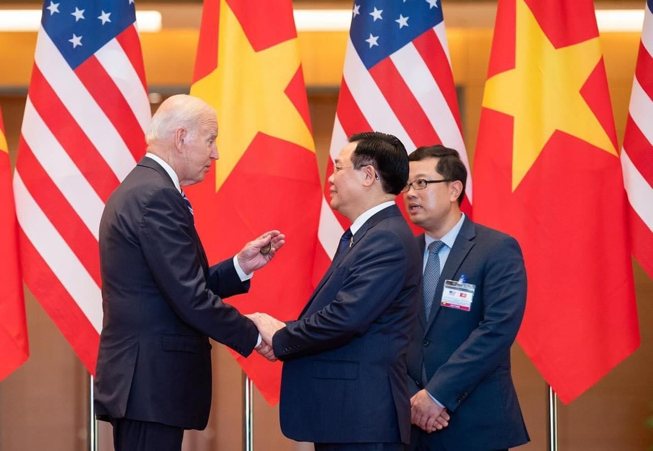 Tổng thống Joe Biden cũng bày tỏ vui mừng đến thăm đất nước Việt Nam tươi đẹp và mến khách, cho biết những nội dung hợp tác quan trọng mà lãnh đạo hai nước đã thỏa thuận ký kết sẽ thúc đẩy quan hệ hai nước có bước phát triển mới trong tương lai, đề nghị Quốc hội Việt Nam tiếp tục có những chính sách để hiện thực hóa các thỏa thuận đã ký kết.