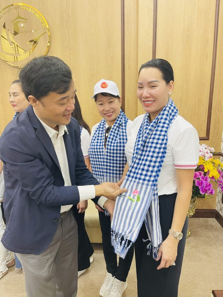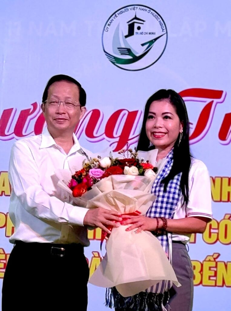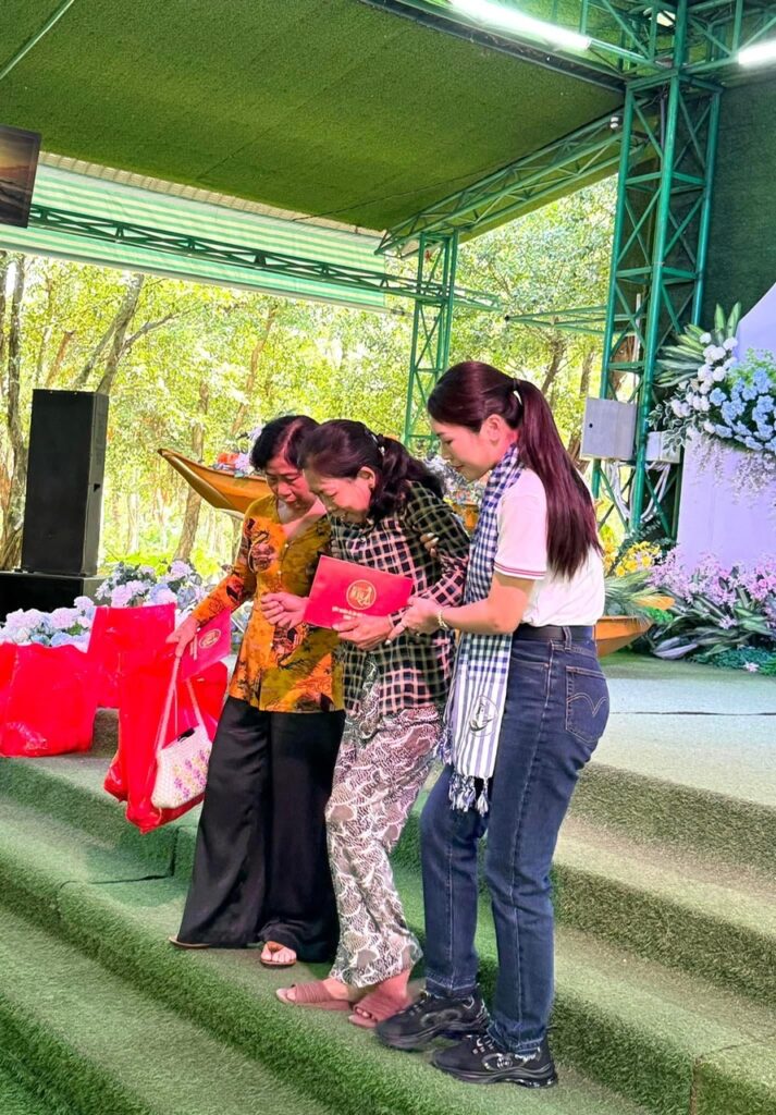 Đại diện lãnh đạo tỉnh Bến Tre tặng hoa cho bà Trần Hoàng Mai Anh, Chủ tịch quỹ nhân ái - Hoa hậu Áo dài phu nhân toàn châu Âu.
