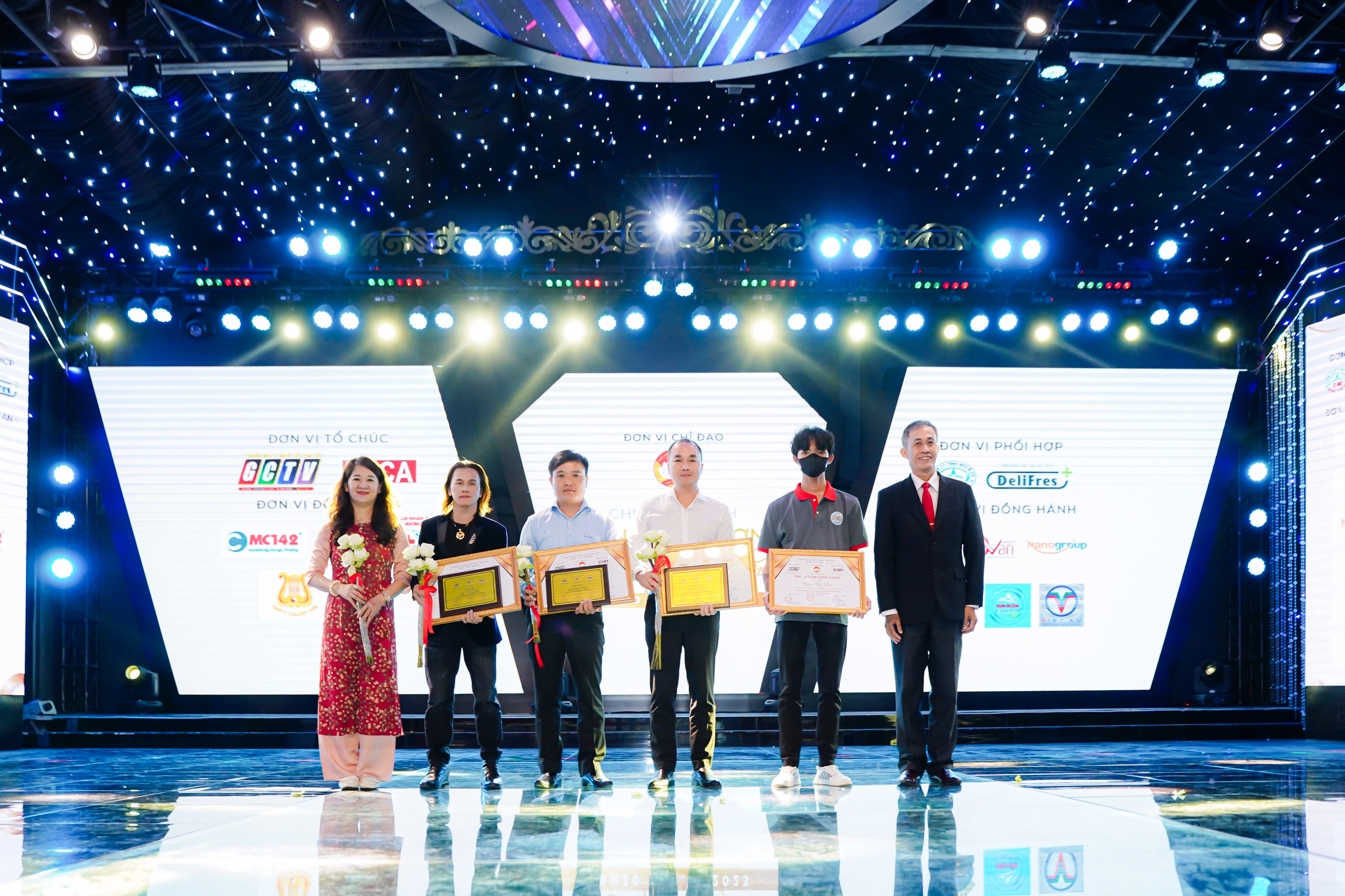 Ca sĩ Tiến khoa – TGĐ Cty Bất Động Sản Tiến Khoa (Ở giữa) nhận vinh danh Tâm Vàng Danh hiệu