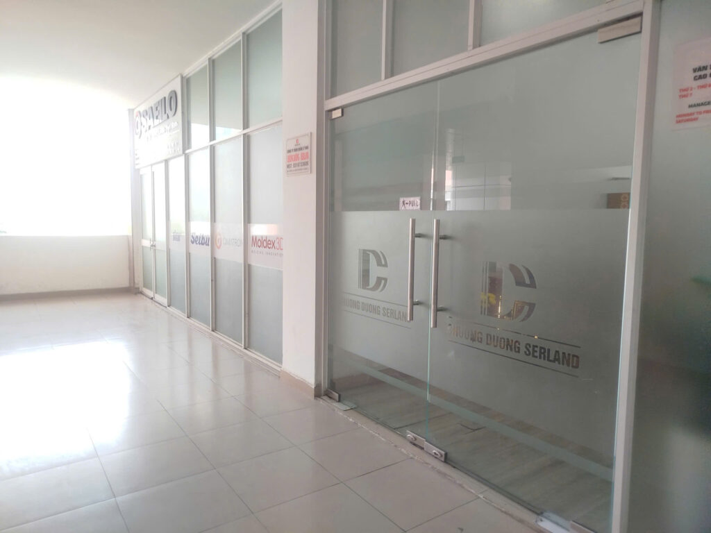 Không gian sinh hoạt chung của cư dân tại tầng 3 được dán bảng hiệu của doanh nghiệp. Ảnh: Việt Hà.