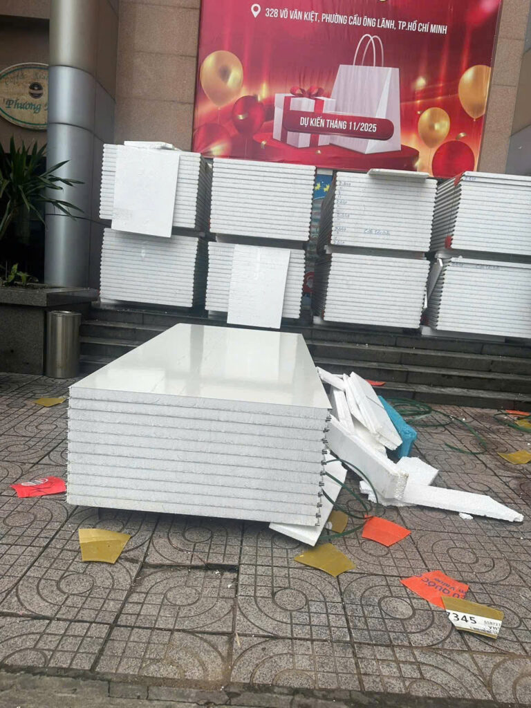 Nhiều hộ dân cho biết, từ tháng 9 khu trung tâm thương mại này đã được đổi mới, thay đổi tên gọi như trước đây, bên cạnh việc thay áo nhiều câu hỏi được cư dân đặt ra về các biện pháp an toàn phòng cháy chữa cháy tại khu vực này. Theo nhiều hình ảnh người dân cung cấp, các vật liệu được cho là để tạo vách ngăn Kiot được tạo ra từ chất liệu mica và mút xốp ở giữa.