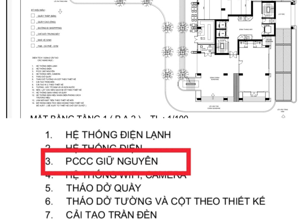 Sơ đồ với chú thích số 3 về giữ nguyên hệ thống PCCC, được cư dân đặt ra câu hỏi liệu có thật sự an toàn. Ảnh: Việt Hà.
