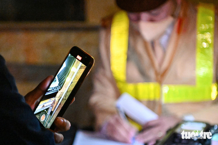Một tài xế vi phạm nồng độ cồn sử dụng điện thoại quay video ghi cảnh sát lập biên bản - Ảnh: HỒNG QUANG