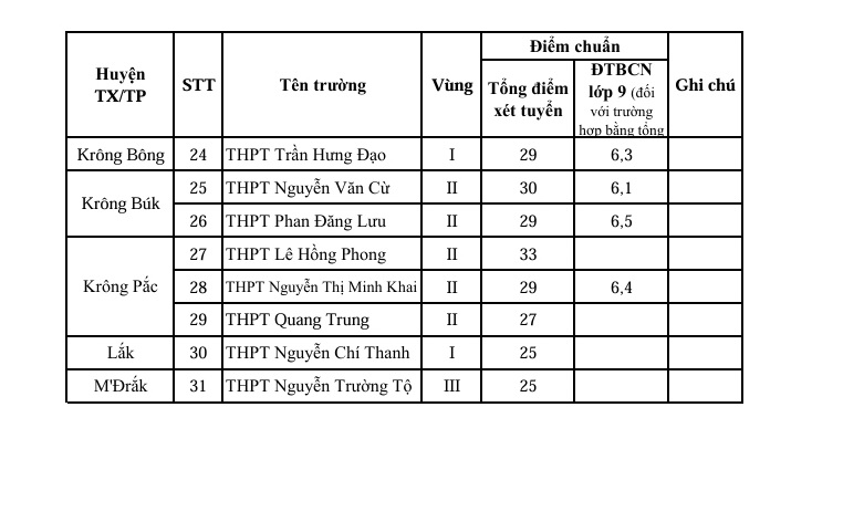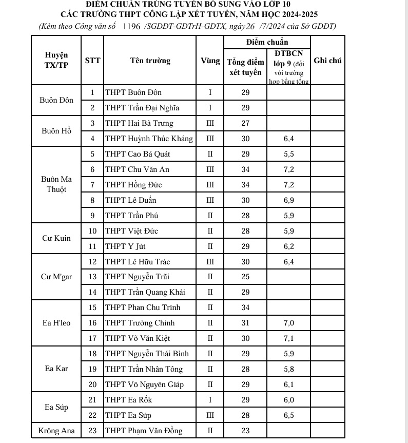 Điểm chuẩn vào lớp 10 (trúng tuyển bổ sung) các trường thpt công lập xét tuyển, năm học 2024-2025 tại Đắk Lắk.