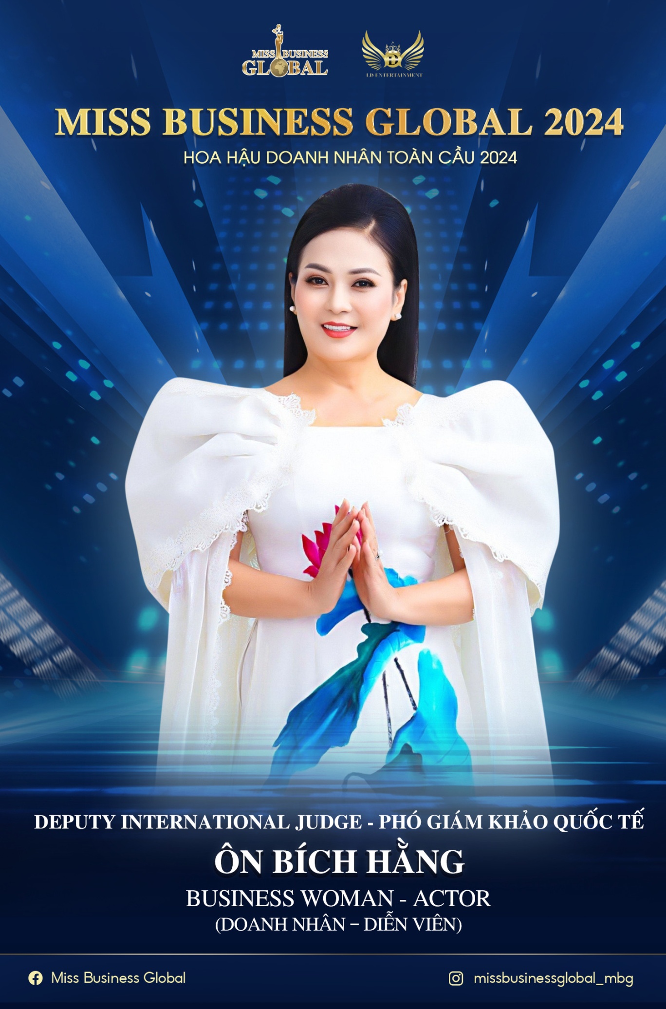 Nghệ sĩ - Diễn viên Ôn Bích Hằng là một nữ diễn viên truyền hình được khán giả yêu mến qua nhiều bộ phim như: Biệt thự Pensée, Trở về 1,2,3, Huyền thoại tím, Đường chân trời, Tha thứ cho anh, Cuộc phiêu lưu Hai Lúa, Những khoảng trời riêng, Cổ tích Việt Nam,v.v...Với kinh nghiệm nhiều năm hoạt động trong lĩnh vực nghệ thuật và từng đảm nhận vai trò giám khảo tại nhiều cuộc thi sắc đẹp trong và ngoài nước Diễn viên Ôn Bích Hằng sẽ đồng hành cùng Ban tổ chức và các thí sinh Miss Business Global 2024 với vai trò là Phó trưởng BGK Quốc tế trong suốt quá trình diễn ra cuộc thi để có thể góp ý và đưa ra những nhận xét đúng nhất, tốt nhất dành cho BTC để chọn ra những gương mặt xuất sắc đảm nhận các danh hiệu cao quý của chương trình.