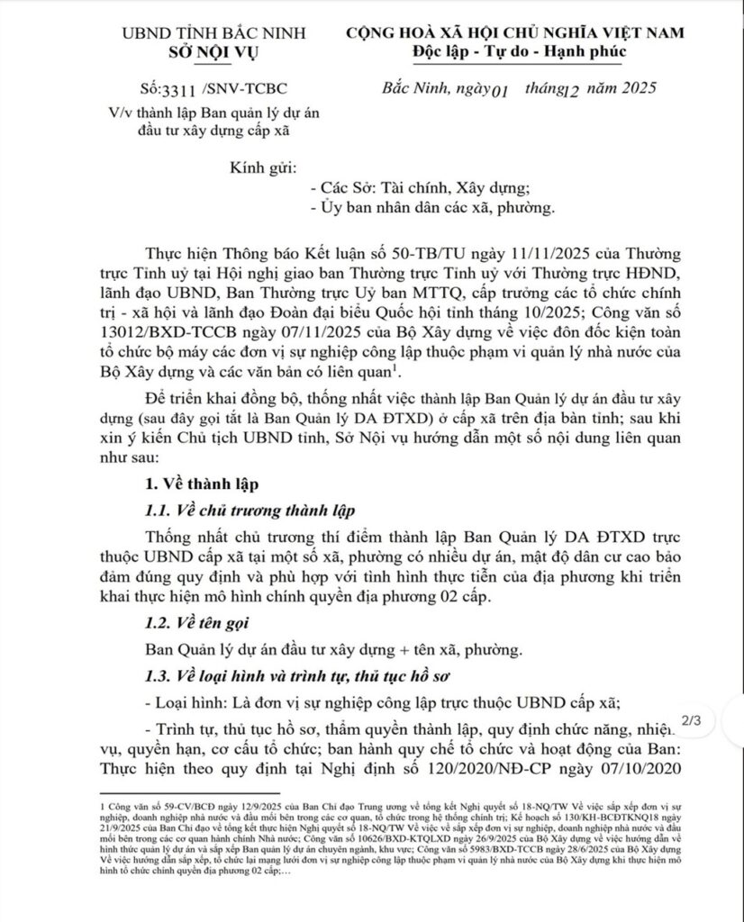 Ngày 01/02/2025, Sở Nội vụ tỉnh Bắc Ninh đã ban hành Công văn số 3311/SNV-TCBC hướng dẫn chi tiết việc thành lập Ban Quản lý dự án đầu tư xây dựng cấp xã/ phường. Điểm đáng chú ý nhất trong văn bản này là: