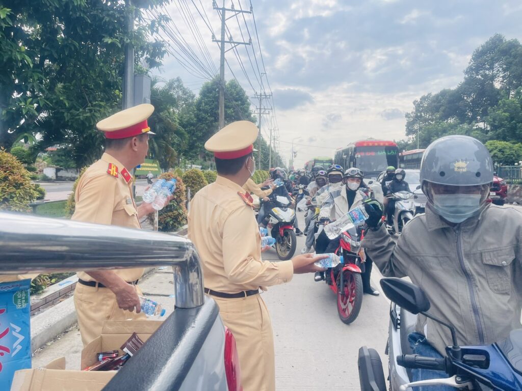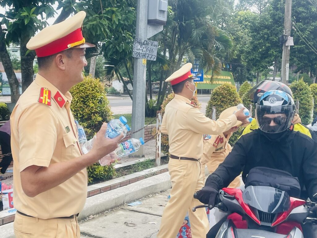 Tại các điểm chốt, nhiều cán bộ, chiến sĩ CSGT đã trực tiếp trao tận tay những chai nước mát lạnh cho người dân, đặc biệt là các gia đình đi xe máy đường dài, người già và trẻ nhỏ. Hành động nhỏ nhưng mang lại niềm vui, sự an tâm và cảm giác được sẻ chia trong những ngày nắng nóng, đường xa.