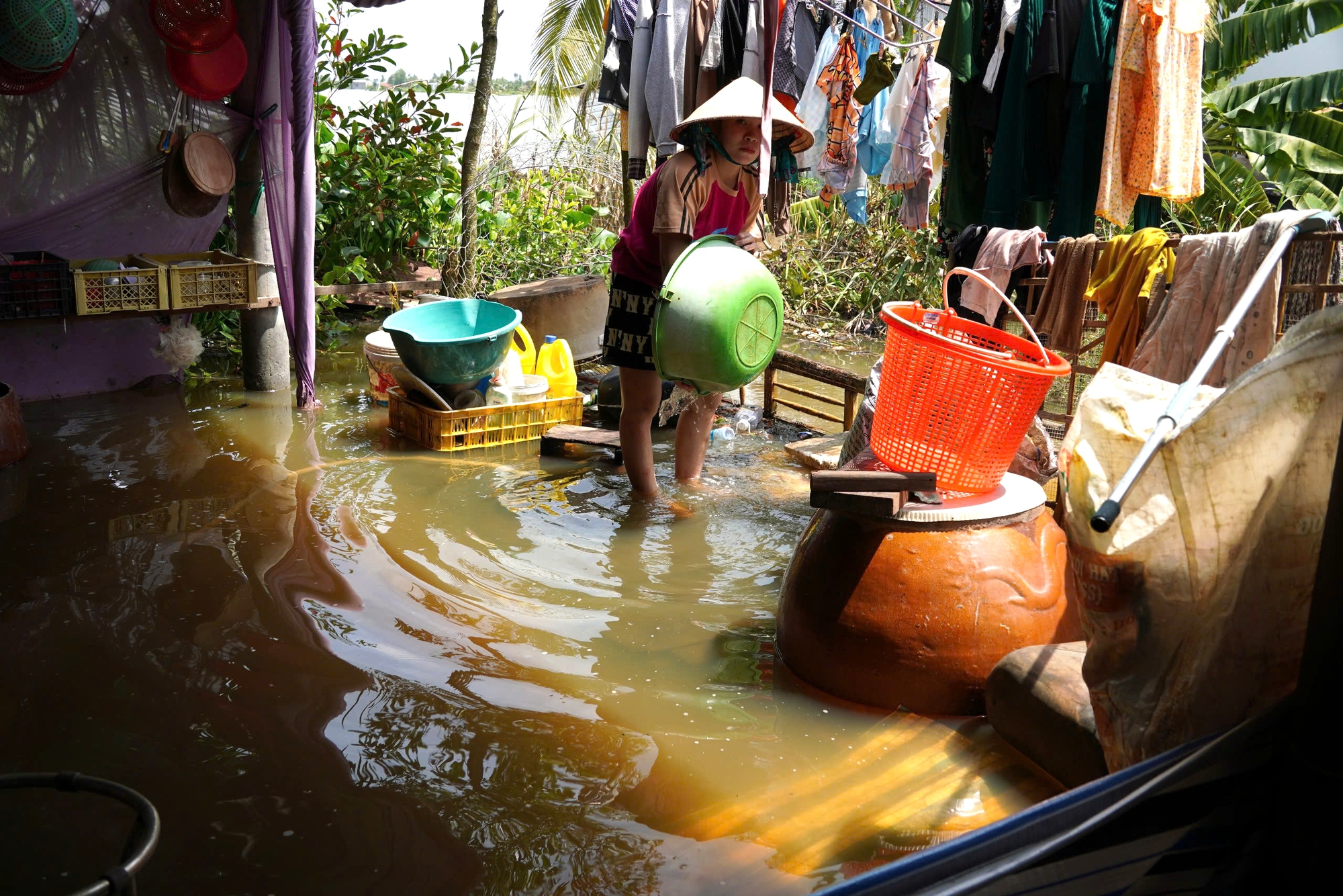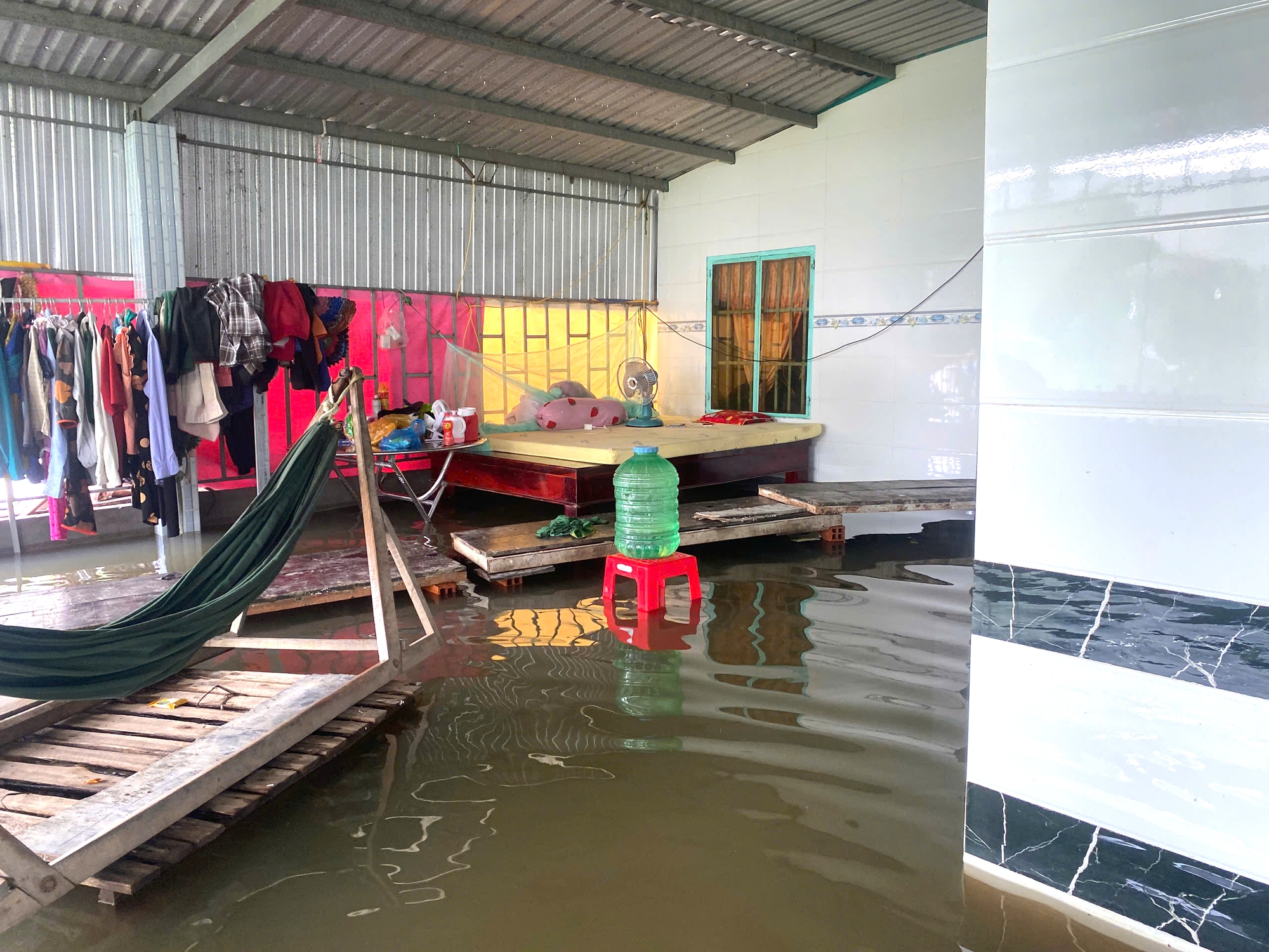 Mọi sinh hoạt từ trong nhà ra ngoài đều trong cảnh "bì bõm" với nước lũ. Ảnh chụp tại một nhà dân ở ấp Cà Dăm, xã Vĩnh Châu - Ảnh: KIM THẠNH