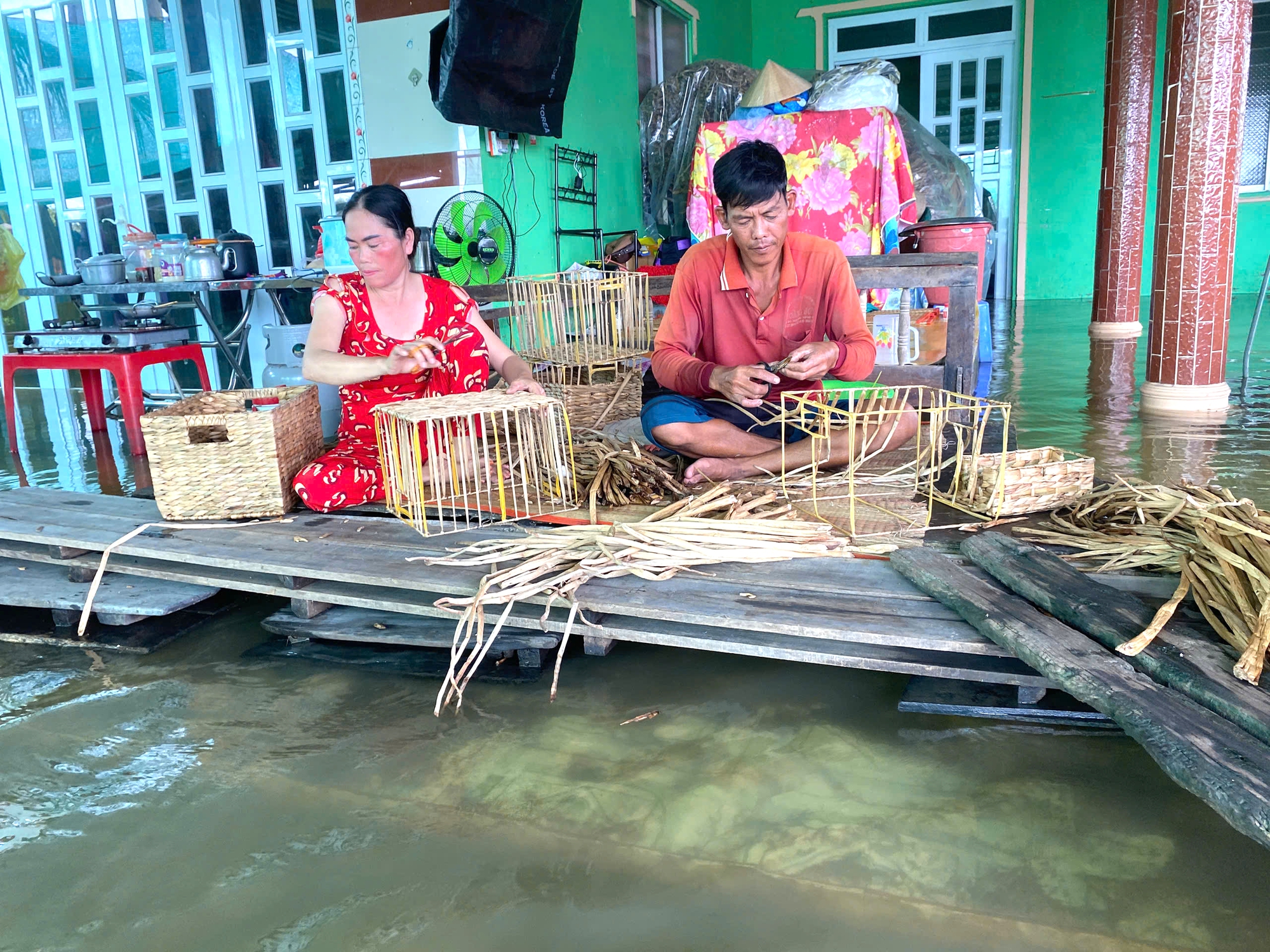 Dù sinh hoạt khá bất tiện nhưng người dân ở ấp Láng Sen, xã Vĩnh Châu vẫn có nhiều cách thích nghi. Một số gia đình vẫn tranh thủ đan lục bình thành các sản phẩm đem bán - Ảnh: KIM THẠNH