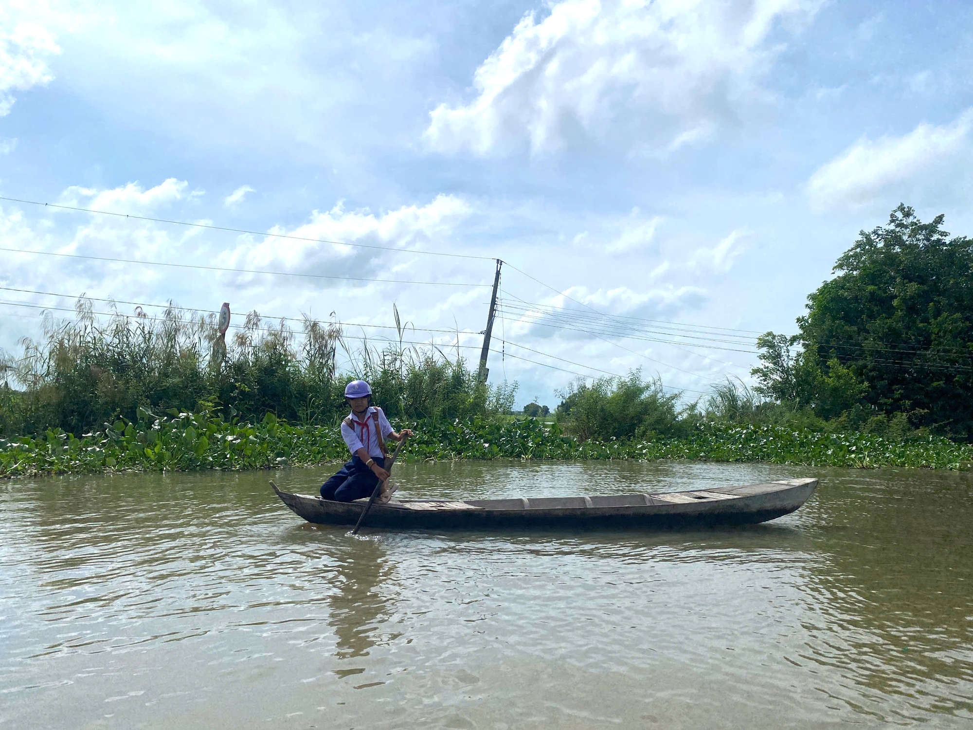 Một em học sinh tự bơi xuồng đi học trong mùa lũ - Ảnh: KIM THẠNH