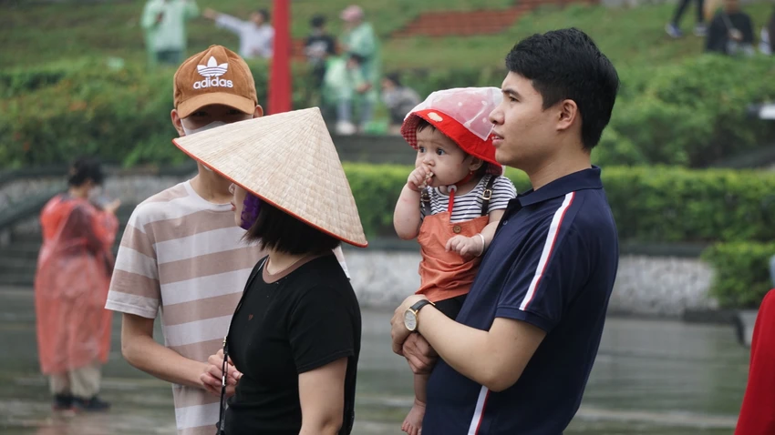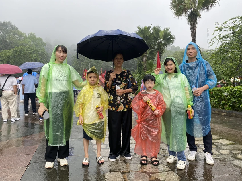 Trong bộ quần áo mưa ướt nhẻm, gia đình anh Thượng, chị Ly ở Hà Nội lên đền Hùng ngày chính hội. Anh Thượng cho biết, dù mưa nhưng cũng cố gắng đi để tri ân các bậc tiền nhân.