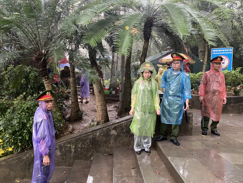 Nhiều người mang ô, mặc áo mưa mang theo lễ vật dâng cúng lên các bậc tiền nhân.
