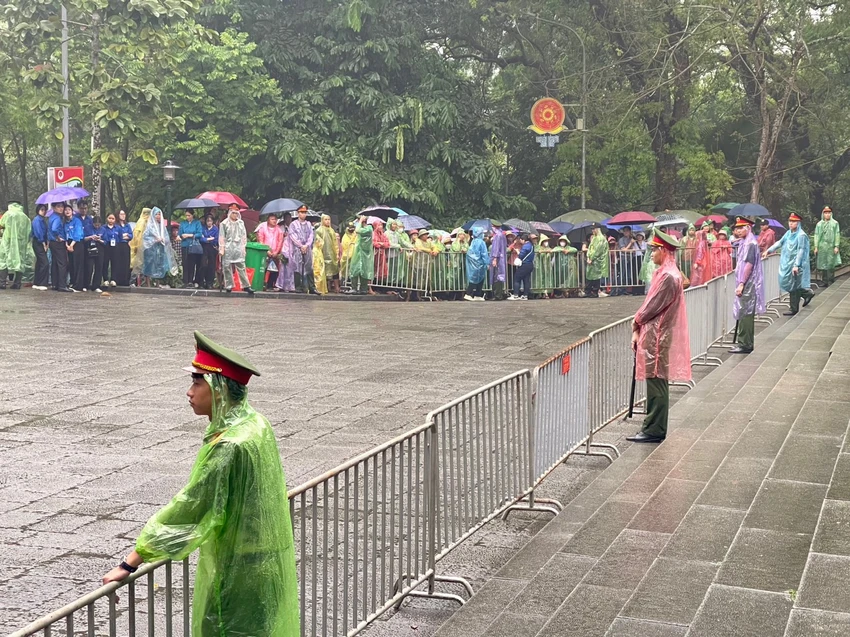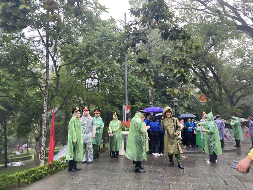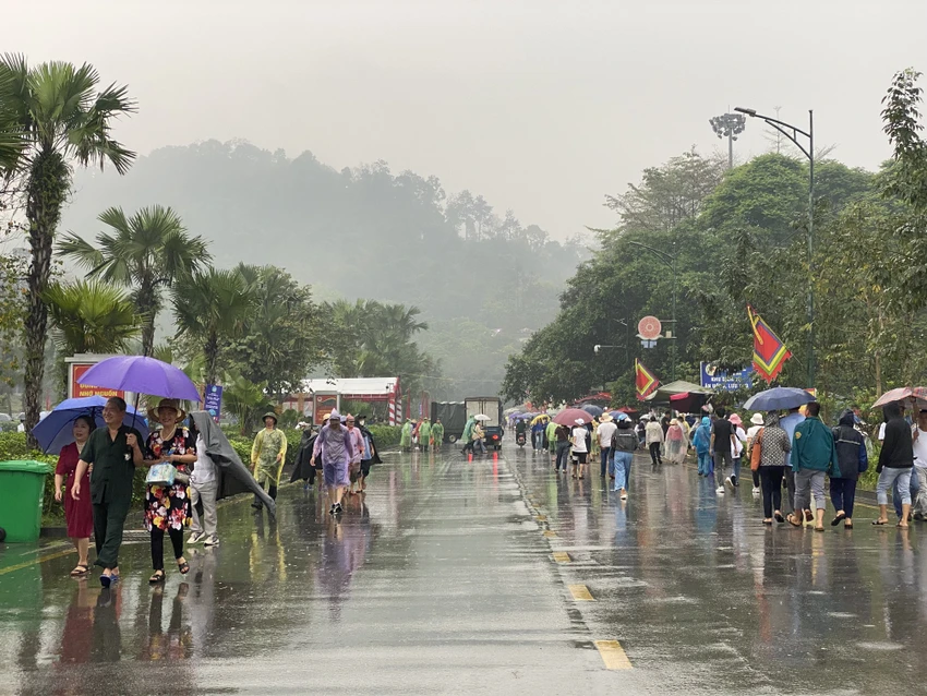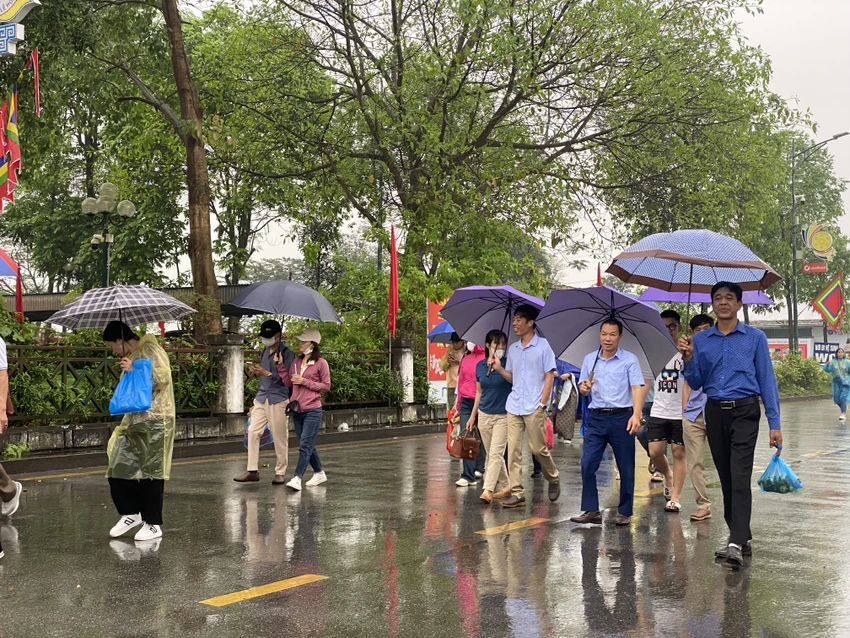 Khoảng gần 7 giờ, trời bắt đầu đổ mưa to. Thời điểm này cũng là lúc các lãnh đạo Đảng, Nhà nước thực hiện nghi thức dâng hương trên đền Thượng, người dân chưa được lên đền.
