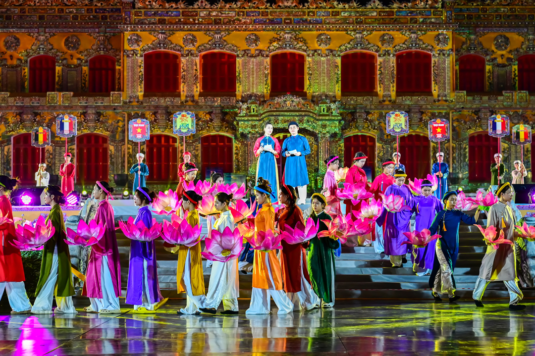 Từ “Bừng sáng miền di sản” mở màn cho chương trình nghệ thuật khai mạc trong không gian lung linh, rực rỡ của cung điện độc đáo bậc nhất Hoàng thành Huế, với sự giao hoà của Nhã nhạc Cung đình Huế - loại hình âm nhạc đặc biệt, thấm đẫm nét văn hoá Huế cùng ca khúc Bừng sáng Kinh đô. Tiết mục được trình diễn bởi 360 diễn viên trên nền sân khấu lộng lẫy nhờ ứng dụng công nghệ chiếu sáng 3D Mapping hiện đại.