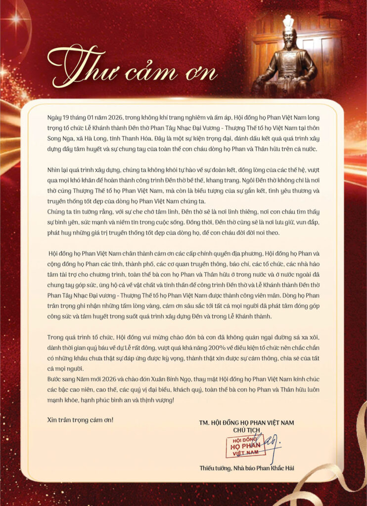 Đứng trước đền thờ mới khánh thành ở Song Nga, mỗi người họ Phan đều có thể thấy mình nhỏ lại, nhưng lòng thì lớn hơn. Lớn bởi niềm tự hào được tiếp nối một dòng họ có cội nguồn gắn với non sông. Lớn bởi ý thức rằng, giữ gìn danh dự tổ tiên không nằm ở lời nói, mà ở cách sống tử tế, ngay thẳng và có ích cho đời.