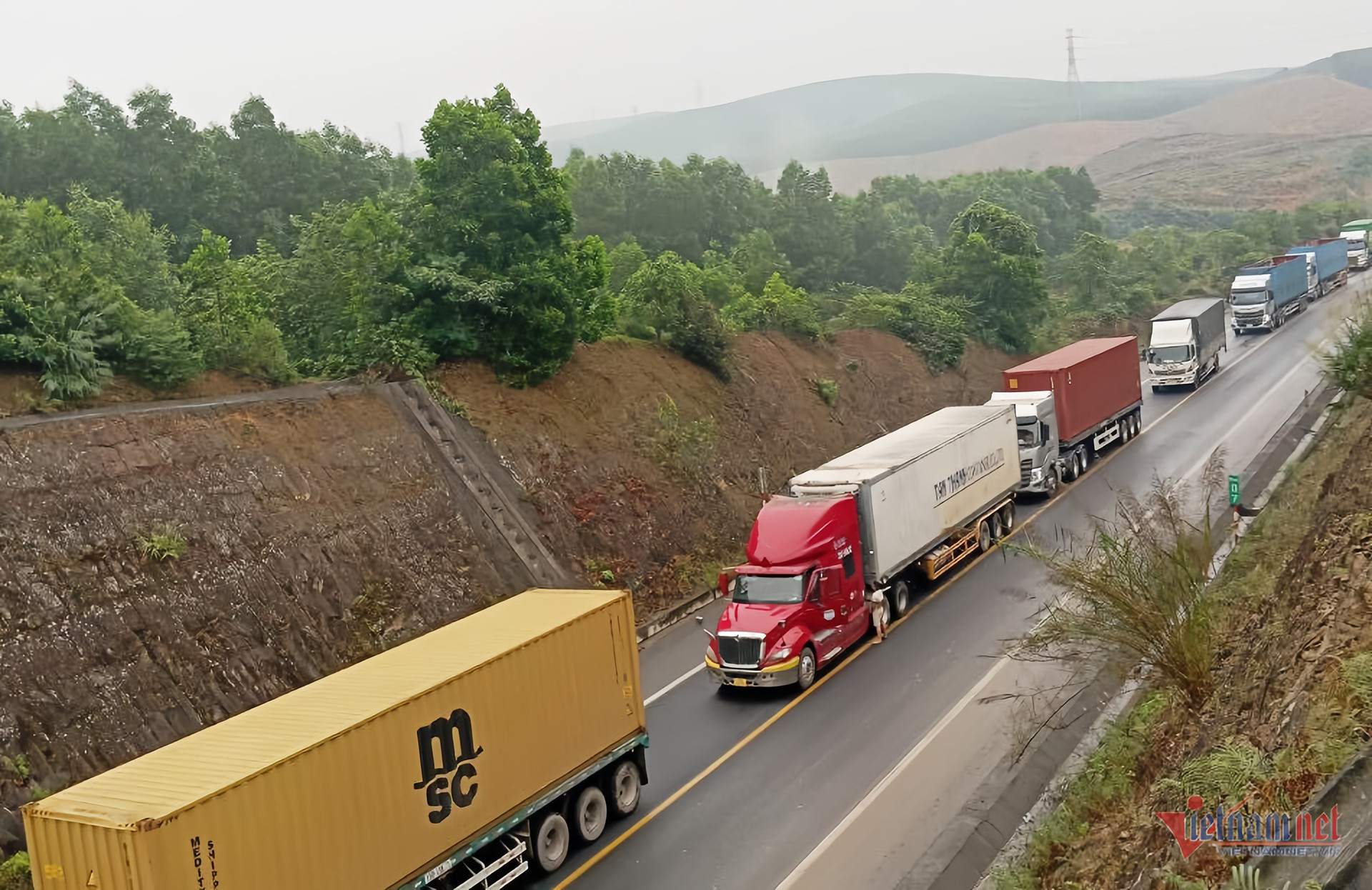Vị trí: Km4 tuyến cao tốc Cam Lộ - La Sơn có một xe tải bị lật nghiêng khiến các tài xế phải dừng xe chờ hàng giờ đồng hồ để lực lượng cứu hộ cẩu xe gặp nạn sáng ngày 8/03/2024. Ảnh: VietNamNet