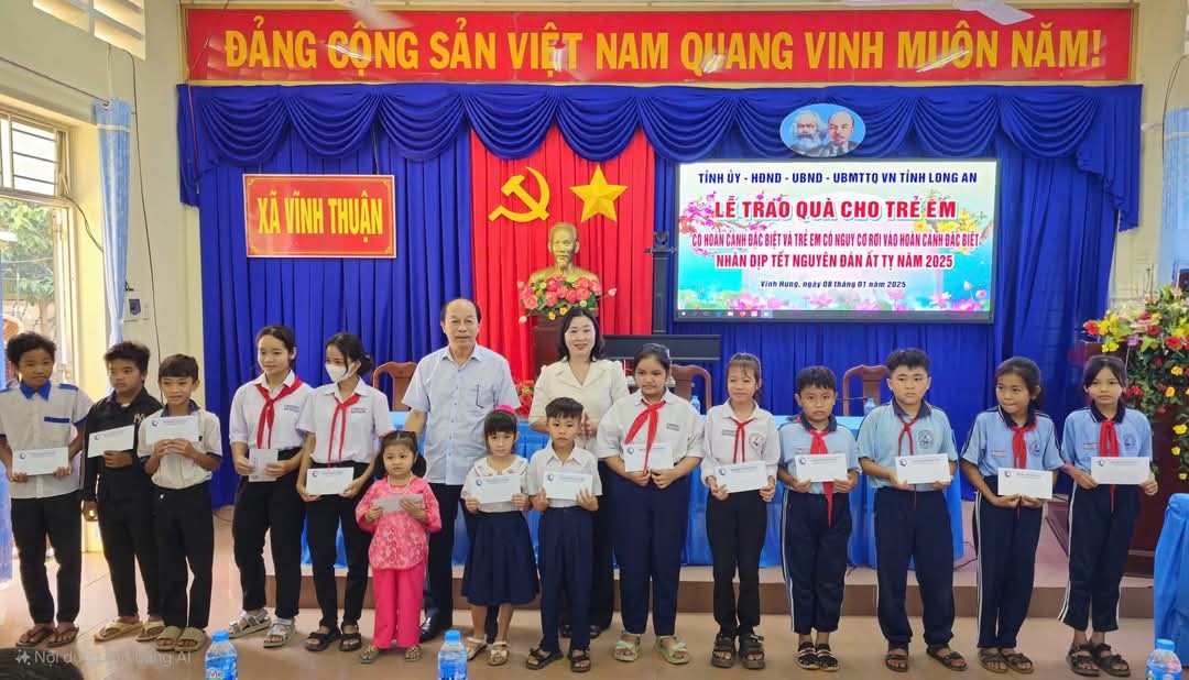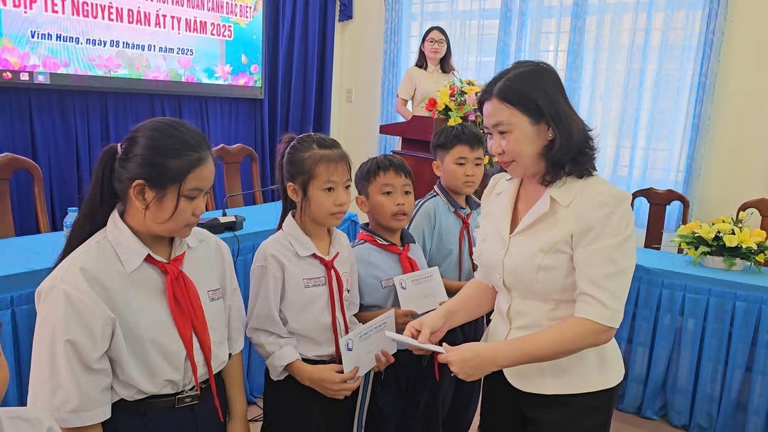 Bà Lê Thị Song An - Tỉnh ủy viên, Phó Trưởng đoàn Đại biểu Quốc hội khóa XV tỉnh trao tặng quà cho trẻ em có hoàn cảnh đặc biệt và trẻ em có nguy cơ rơi vào hoàn cảnh đặc biệt trên địa bàn huyện-ảnh Xuân Khang