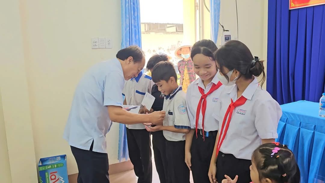 Ông Lê Thanh Nghiêm - UV.BTV Tỉnh ủy, Trưởng Ban Tổ chức Tỉnh ủy trao tặng quà cho trẻ em có hoàn cảnh đặc biệt và trẻ em có nguy cơ rơi vào hoàn cảnh đặc biệt trên địa bàn huyện-ảnh Xuân Khang