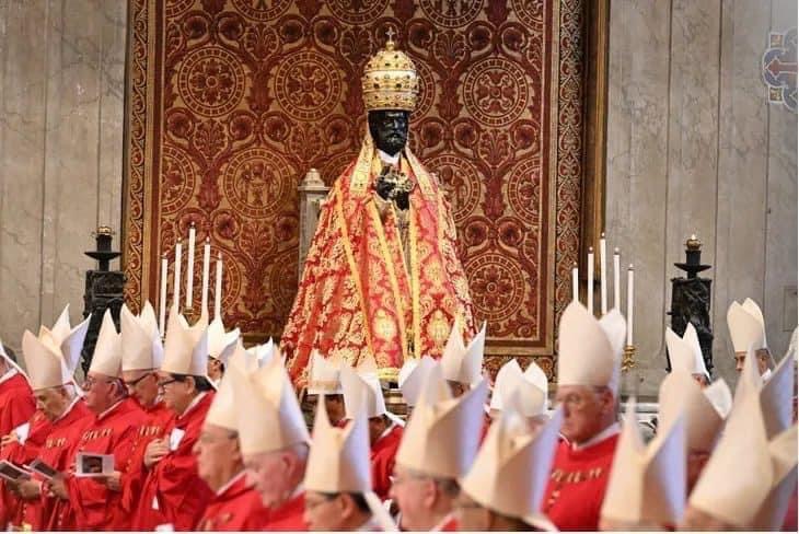 ảnh: Tượng Thánh Phêrô phủ chiếc áo choàng màu đỏ và vàng, và đội mũ miện