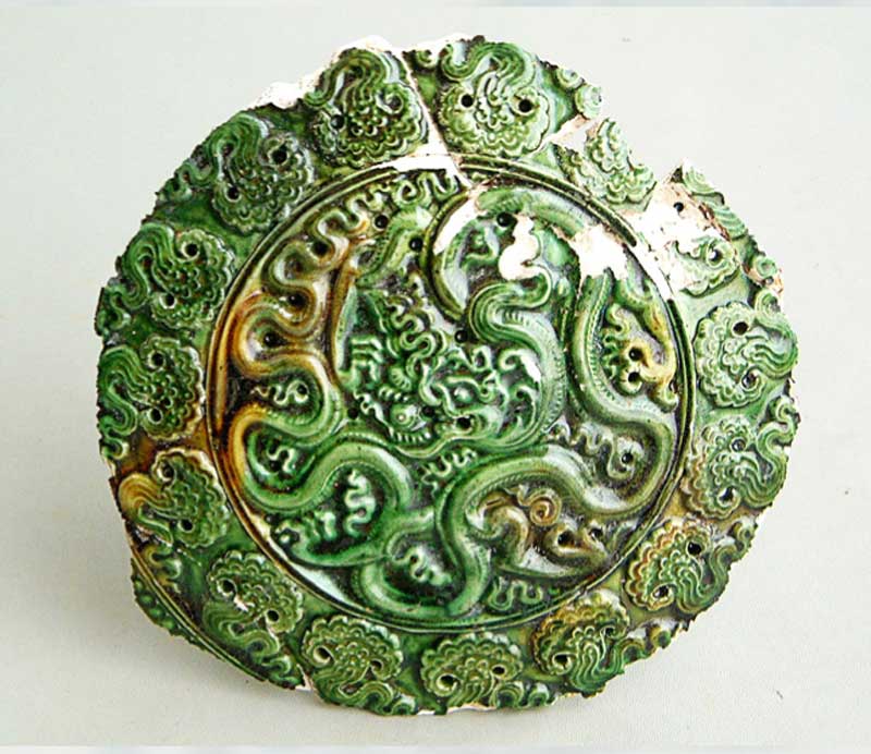 Nắp hộp, gốm men lục, trang trí rồng mây, thời Lý, thế kỷ XI, Khu di tích Hoàng Thành Thăng Long. Ảnh: Trần Đức Anh Sơn