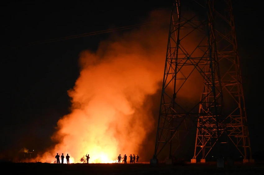 Đám cháy lan rộng ra khu vực lớn bên dưới lưới điện cao thế. Ảnh: CTV