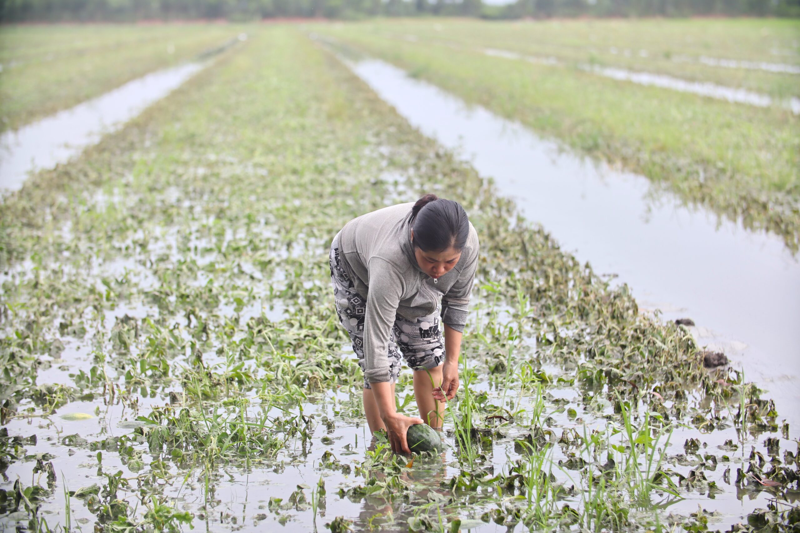 Chị Nhi nhặt những trái dưa hấu còn lại trên ruộng dưa đã bị ngập úng. Ảnh:HD