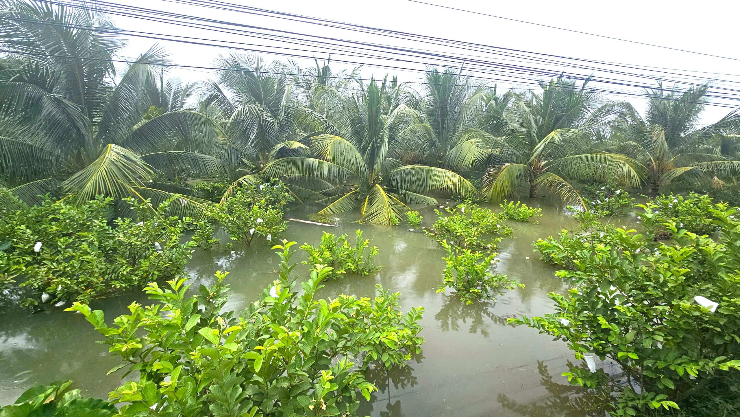 Suốt 3 ngày qua, hơn 1.400 gốc ổi, măng cụt, mít, chanh, dừa,… ngập sâu trong nước từ 1,3-1,5m và cần khoảng 7 ngày nữa mới có thể khắc phục. Do thời gian ngập kéo dài nên hầu hết cây ăn trái trong vườn không thể cứu vãn được nữa, anh Minh chỉ hy vọng phục hồi được 600 gốc dừa. Ước tính anh thiệt hại hơn 300 triệu đồng.