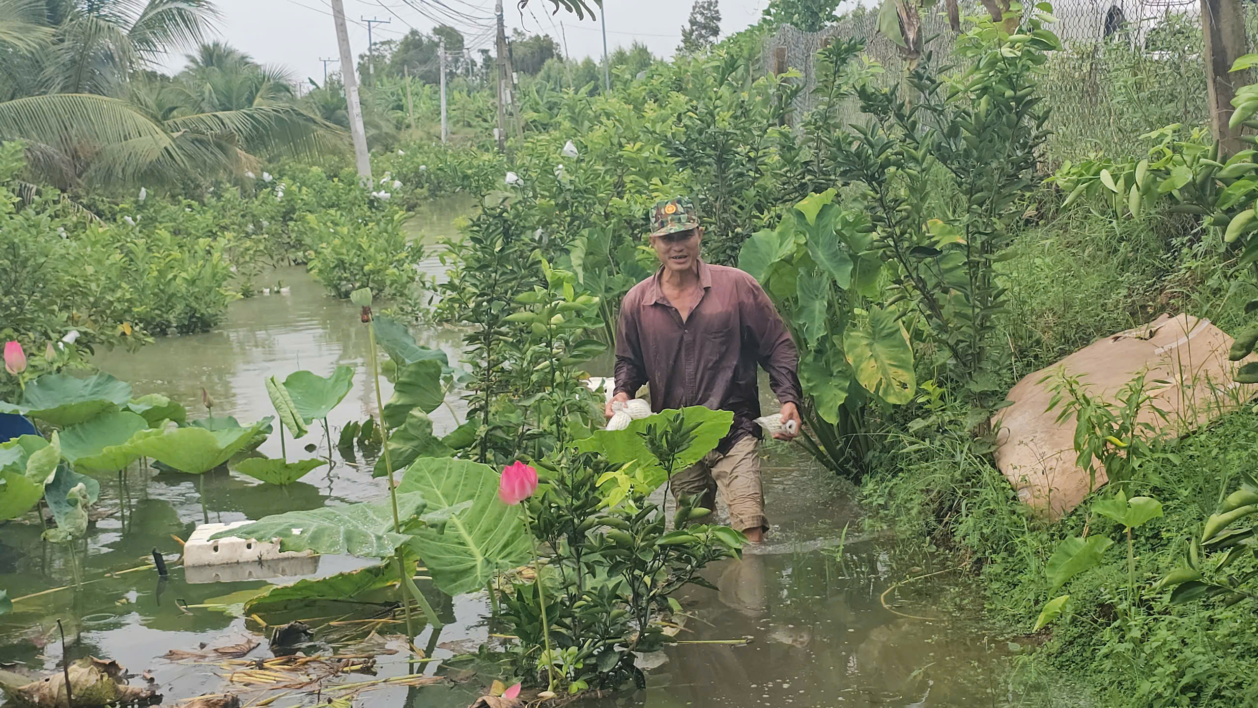 Anh Minh cho biết: "Mười mấy năm nay mới gặp lại cảnh mưa ngập lụt thế này, cây mưa lớn quá lớn, lại kéo dài. Nước ngập kiểu này coi như xong, giờ chỉ biết cứu được cây dừa thôi, các cây còn lại không thể cứu được nữa".