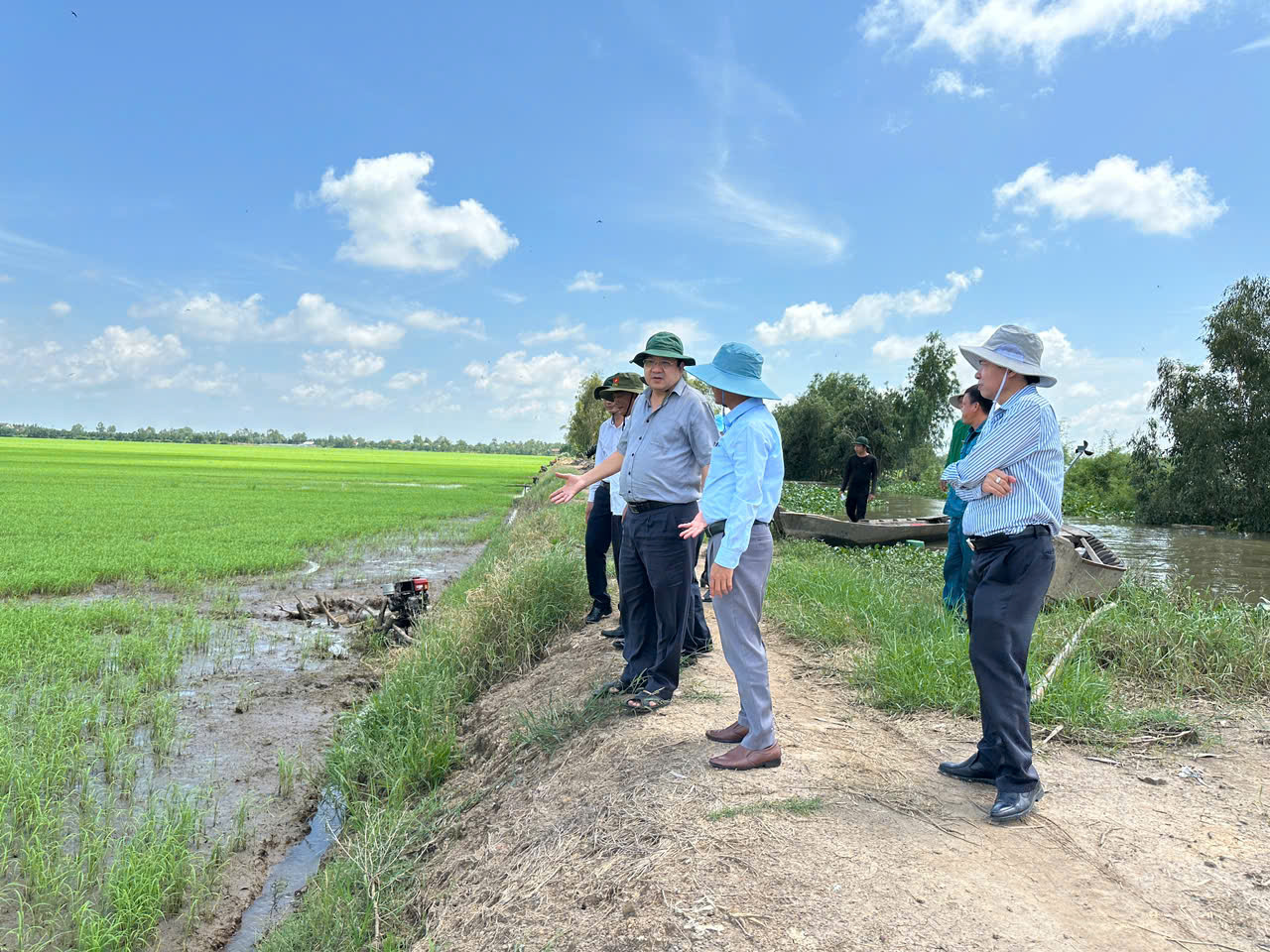 Đoàn công tác khảo sát tình hình lũ gây ảnh hưởng sản xuất tại huyện Tân Thạnh. Ảnh: TH