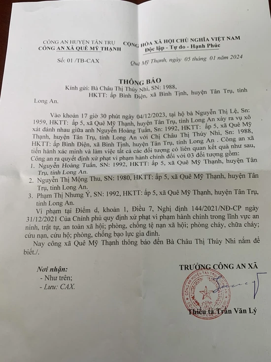 Sáng 11/1, theo thông tin từ Công an huyện Tân Trụ (Long An), Công an xã Quê Mỹ Thạnh vừa ra quyết định xử phạt hành chính đối với đối tượng Nguyễn Hoàng Tuấn (31 tuổi), Nguyễn Thị Nhưng Ý (31 tuổi), Nguyễn Thị Mộng Thu (44 tuổi) cùng ngụ ấp 5, xã Quê Mỹ Thạnh, huyện Tân Trụ, về hành vi "Vô ý gây thương tích hoặc gây tổn hại cho sức khỏe của người khác nhưng không bị truy cứu trách nhiệm hình sự" theo điểm D, khoản 1 điều 7 Nghị định 144/2021.CP-NĐ, mức phạt từ 300.000-500.000 đồng.