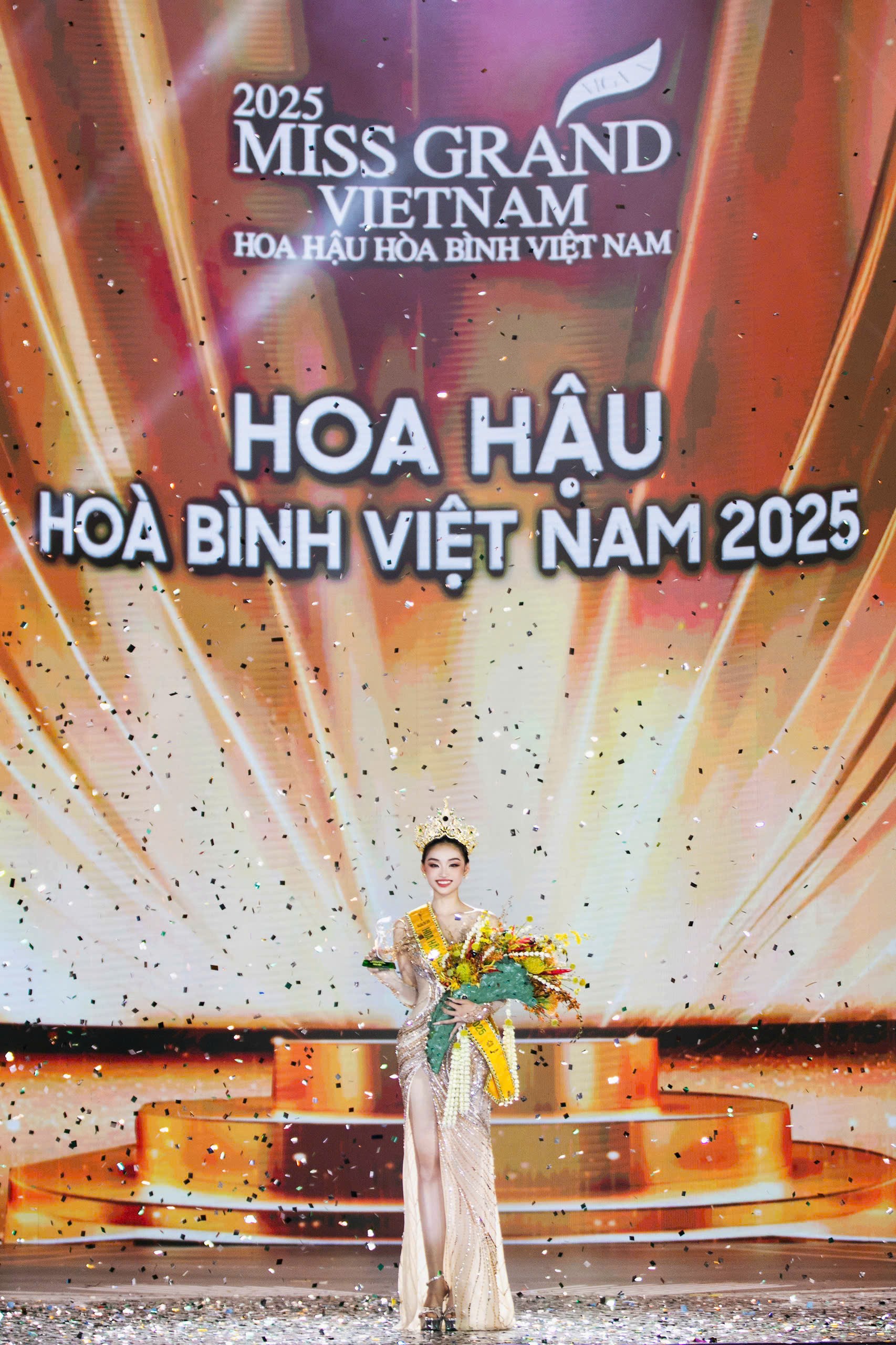 Hoa hậu Võ Lê Quế Anh trong phần final Walk Tiếp đó, BTC Miss Grand Vietnam 2025 công bố top 5 chung cuộc gồm: La Ngọc Phương Anh (An Giang); Nguyễn Thị Yến Nhi ( Đắk Lắk); Nguyễn Thị Thu Ngân (Cà Mau); Lê Thị Thu Trà (SBD 456 – Nghệ An); Đinh Y Quyên (Gia Lai).