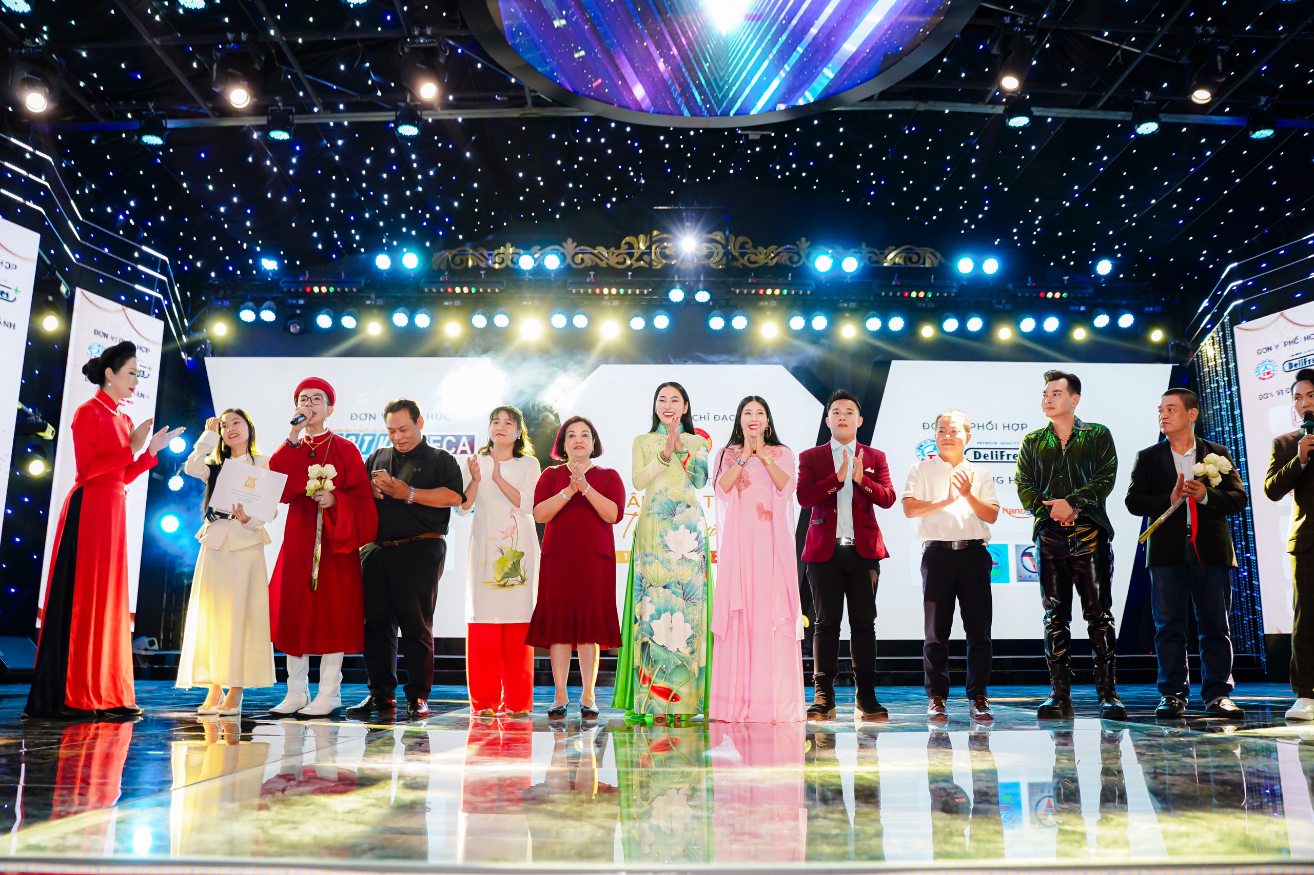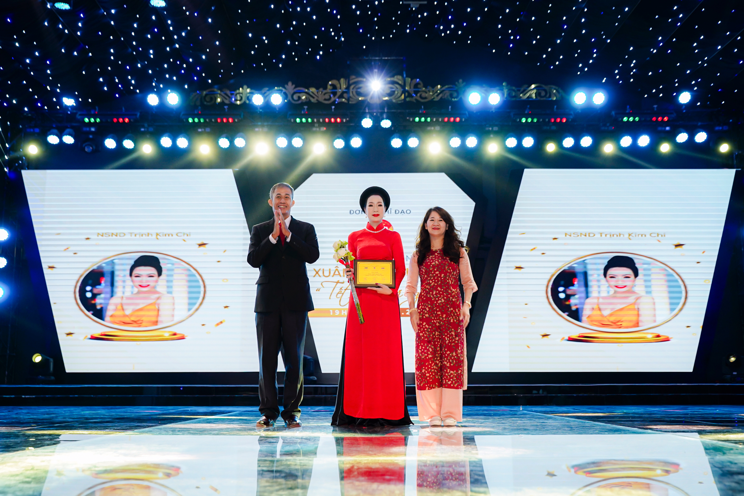 Ông Võ Văn Thiện Trưởng ban Công tác Phía Nam Uỷ Ban Trung ương MTTQVN và bà Ngô Thị Phương Liên Chuyên viên cao cấp vụ Khoa giáo Văn xã Văn phòng Chính phủ trao vinh danh cho NSND Trịnh Kim Chi