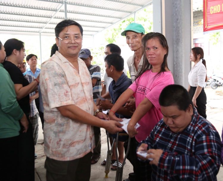 Ông Phan Mạnh Hùng ân cần, trao tận ay cho các nạn nhân Dioxin có hoàn cảnh khó khăn
