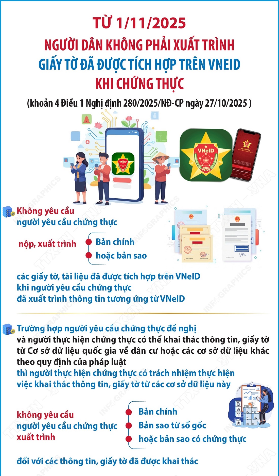 Nghị định số 280/2025/NĐ-CP quy định thêm: người thực hiện chứng thực không yêu cầu người yêu cầu chứng thực nộp, xuất trình bản chính hoặc bản sao các giấy tờ, tài liệu đã được tích hợp trên VNeID khi người yêu cầu chứng thực đã xuất trình thông tin tương ứng từ VNeID.