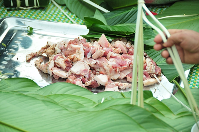 Trong mỗi gói đỗ những miếng thịt lợn ngon được người gói khéo léo bọc kín trong lớp đỗ.