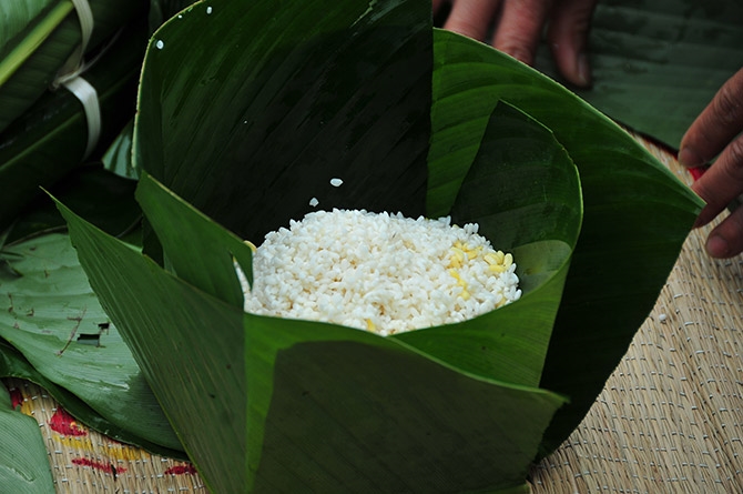 Sau khi xếp lá vào khuôn, bạn cho từng loại nguyên liệu vào theo thứ tự nếp – đậu xanh – thịt mỡ – đậu xanh – nếp và gói thật kỹ, sau đó buộc chặt bánh bằng dây lạt. Cho bánh vào nồi, đổ ngập nước và nấu trong khoảng 8 – 10 giờ là bánh chín.