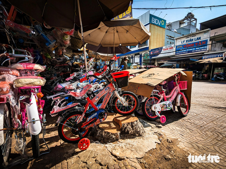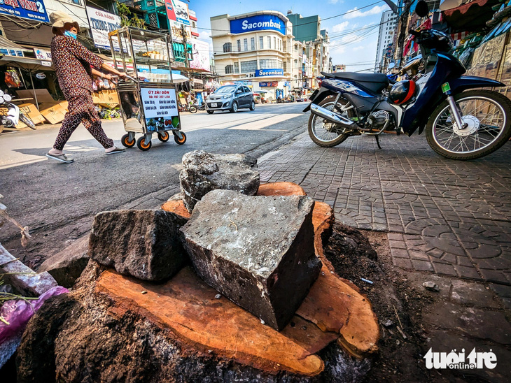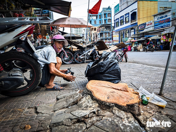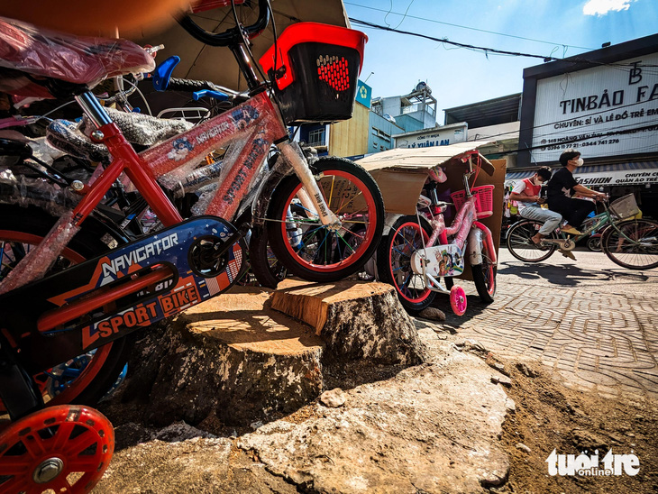 Người kinh doanh bày xe đạp trên gốc cây lim xẹt vừa bị cưa hạ mấy ngày trước - Ảnh: TẤN LỰC