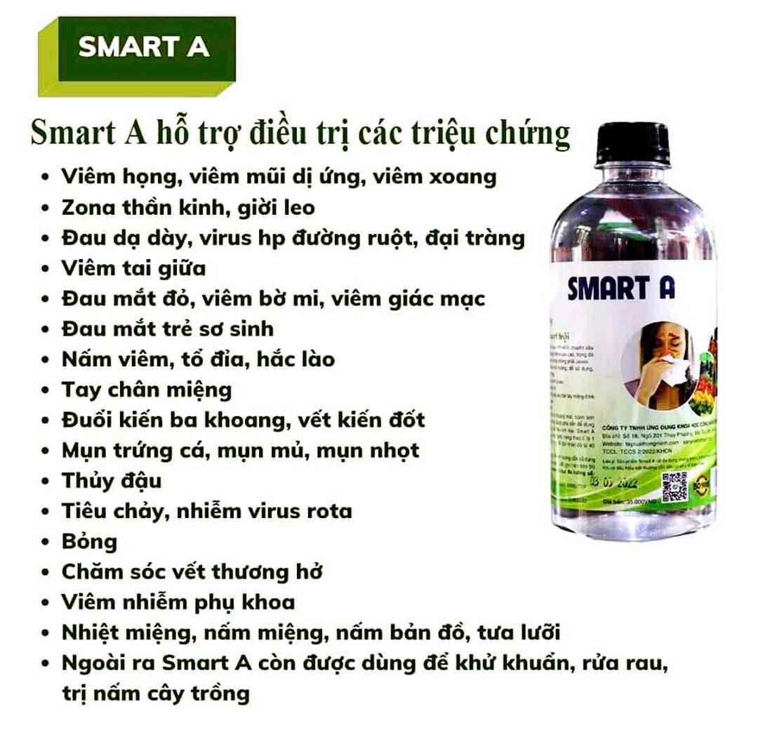 Giới thiệu về sản phẩm và thương hiệu Smart A - đây là thương hiệu nổi tiếng của công ty TNHH ứng dụng khoa học công nghệ Quốc tế do Tiến sĩ Hà Văn Nam sáng lập & điều hành. Sản phẩm Smart A – nước muối điện hóa có tác dụng diệt khuẩn tuyệt vời. Đây là sản phẩm thu được qua quá trình điện phân dung dịch nước muối 0,5%, trên dây chuyền công nghệ hiện đại và màng lọc có tính bí quyết. Dù mới ra đời được ba năm, dung dịch Smart A đã được thị trường biết đến là nước súc miệng, nước sát trùng tuyệt vời, có thể hỗ trợ xử lý nhanh và triệt để nhiều vấn đề sức khỏe như các bệnh viêm răng lợi, nhiệt miệng, viêm họng, viêm nhiễm ngoài da, các vết thương hở, vết bỏng, thủy đậu, bệnh tay chân miệng, zona thần kinh, và các bệnh ngoài da khác.