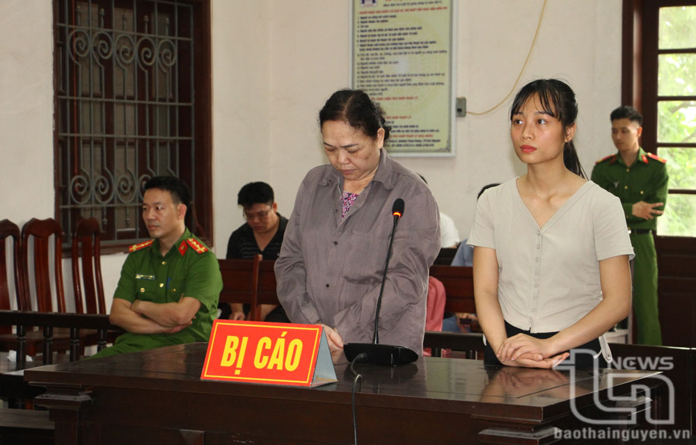 Bị cáo Dương Thị Kim Cúc (trái) và Đặng Thị Huyền Đức tại phiên tòa.