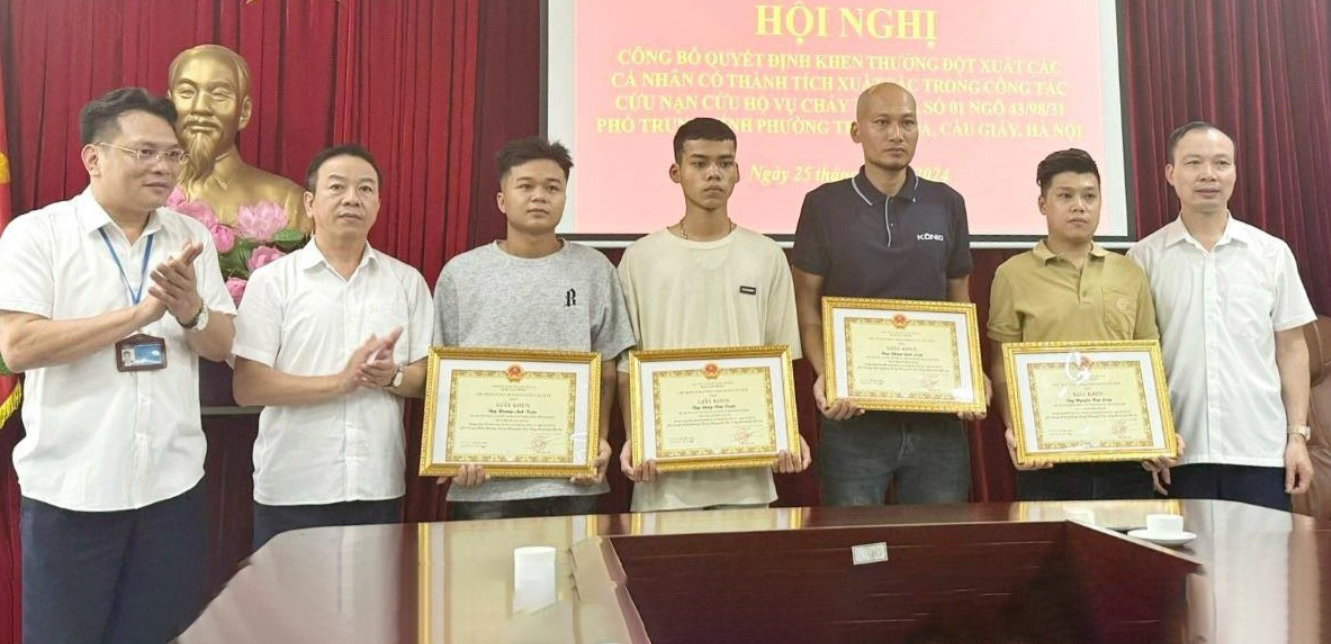 Trước đó, UBND quận Cầu giấy, Hà Nội cũng đã khen thưởng đột xuất bốn công dân nêu trên đã dũng cảm tham gia cứu các nạn nhân bị mắc kẹt trong vụ cháy 14 người tử vong hôm 24-5.