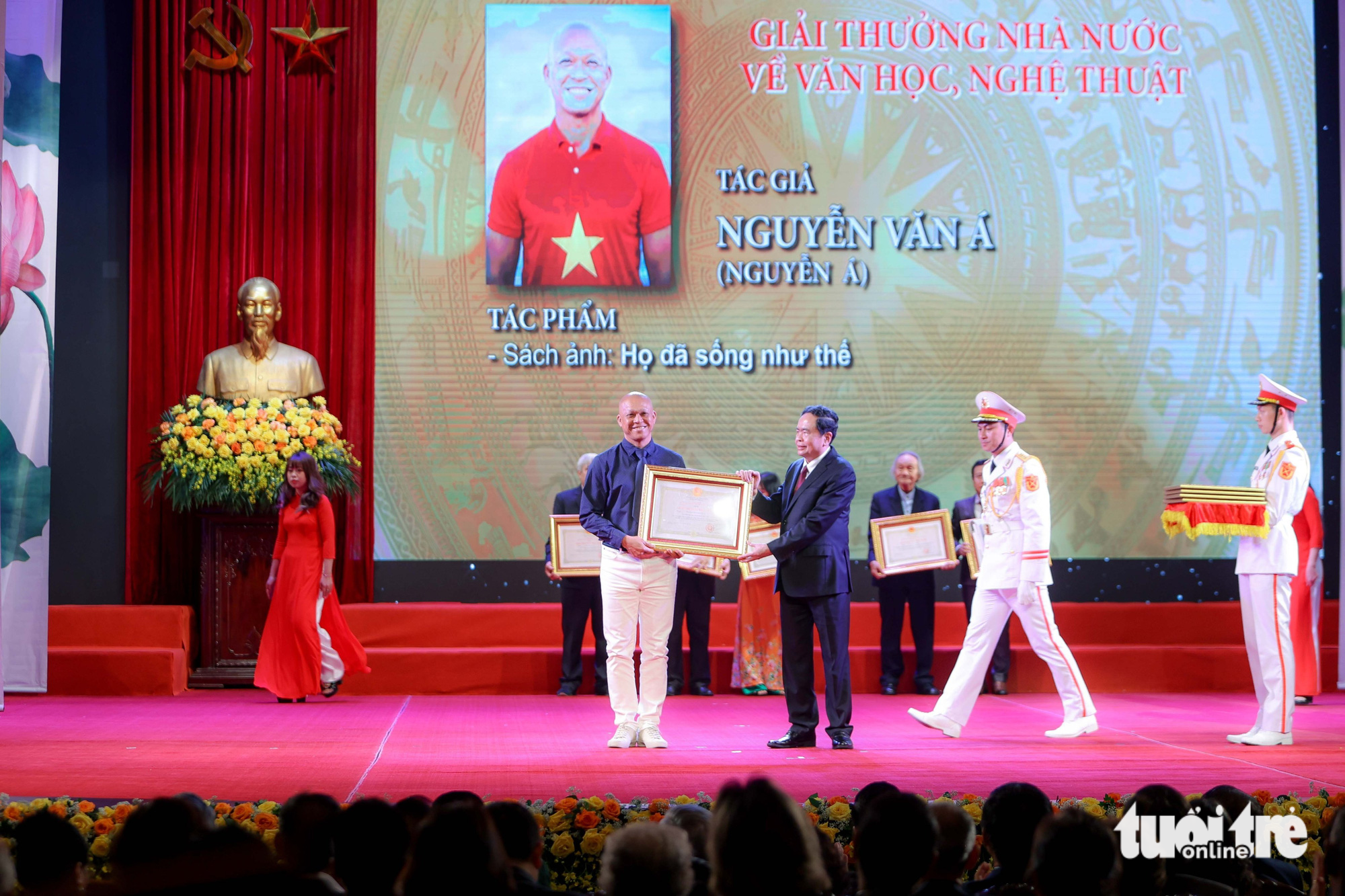 Họa sĩ Nguyễn Phan Bách (trái) - trưởng nam của nhà văn Nguyễn Huy Thiệp - nhận Giải thưởng Nhà nước được trao cho bố mình - Ảnh: NGUYỄN KHÁNH