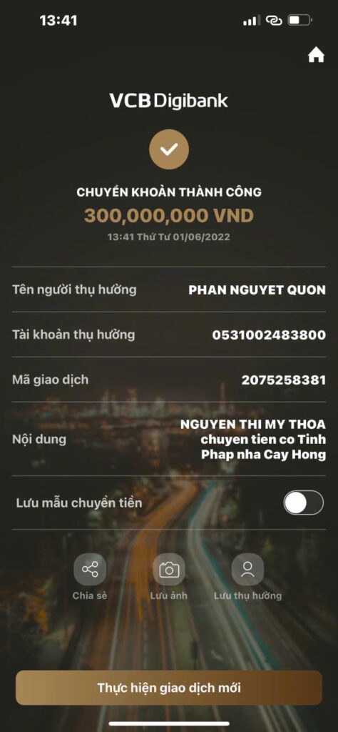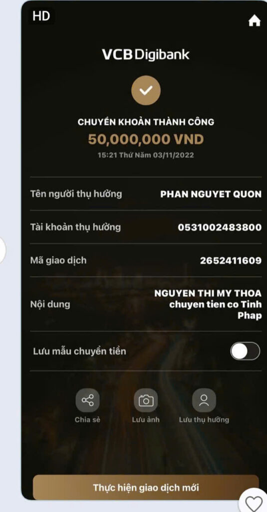 Cũng trong thời gian này, bà Thoa phát hiện nhiều khoản tiền mình chuyển cho ông Thành sau đó lại được chuyển sang tài khoản của bà Minh. Điều này khiến bà nghi ngờ có sự phối hợp giữa các cá nhân liên quan nhằm trục lợi.