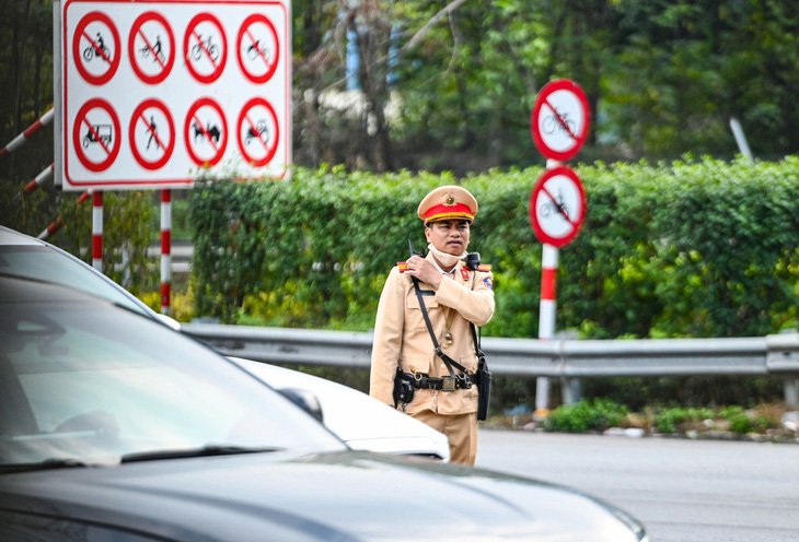 Cảnh sát giao thông túc trực tại các nút giao để phân luồng, sẵn sàng xử lý sự cố ngay sau kỳ nghỉ Tết - Ảnh: HỒNG QUANG