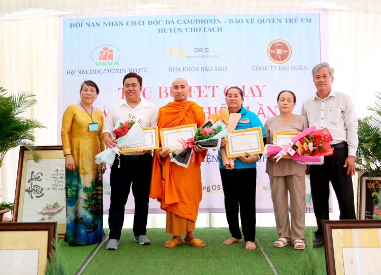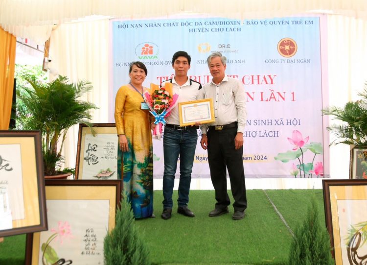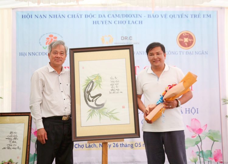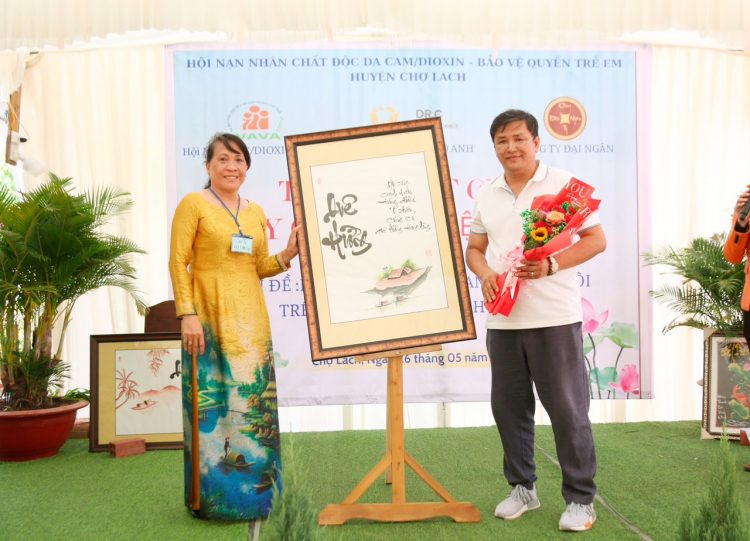 Ông Vương Quốc Minh đại diện Viện IMRIC và Viện IRLIE nhận thư cảm ơn và hoa từ UBND huyện và Hội nạn nhân chất độc da cam/dioxin huyện Chợ Lách